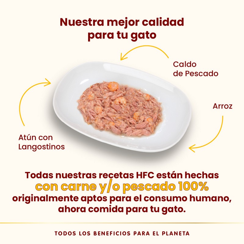 La comida húmeda Almo Nature HFC está elaborado con ingredientes originalmente aptos para el consumo humano y posteriormente utilizados como alimento para gatos. En nuestras recetas HFC no utilizamos harinas ni carne deshidratada, y la carne y el pescado que incluye es la mismos que podrías elegir para ti mismo.