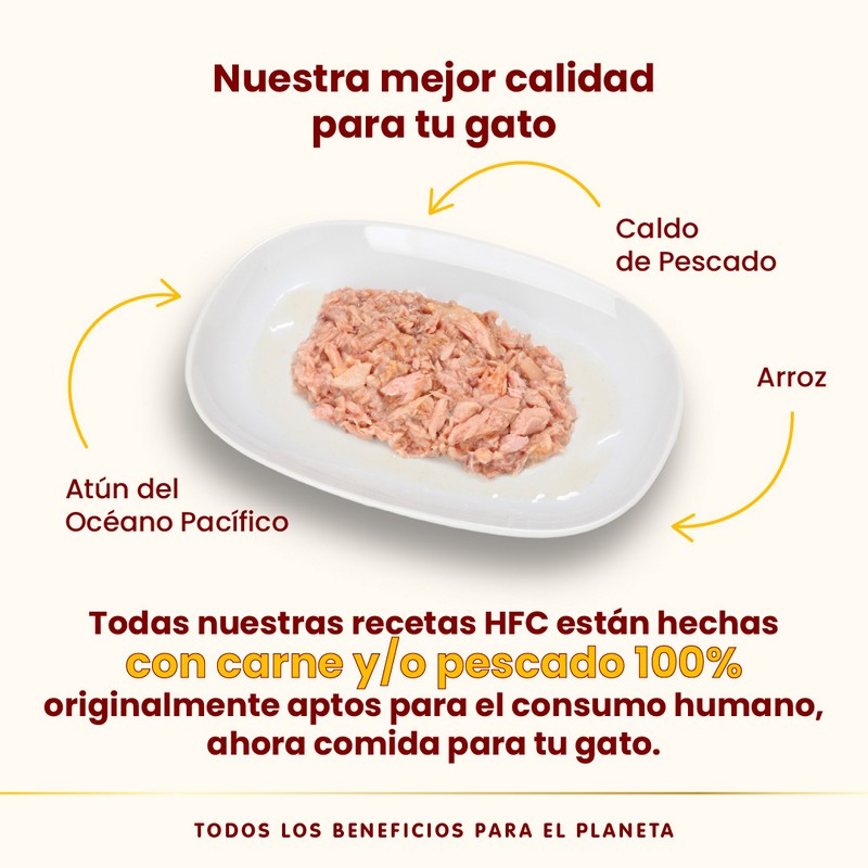 La comida húmeda Almo Nature HFC está elaborado con ingredientes originalmente aptos para el consumo humano y posteriormente utilizados como alimento para gatos. En nuestras recetas HFC no utilizamos harinas ni carne deshidratada, y la carne y el pescado que incluye es la mismos que podrías elegir para ti mismo.