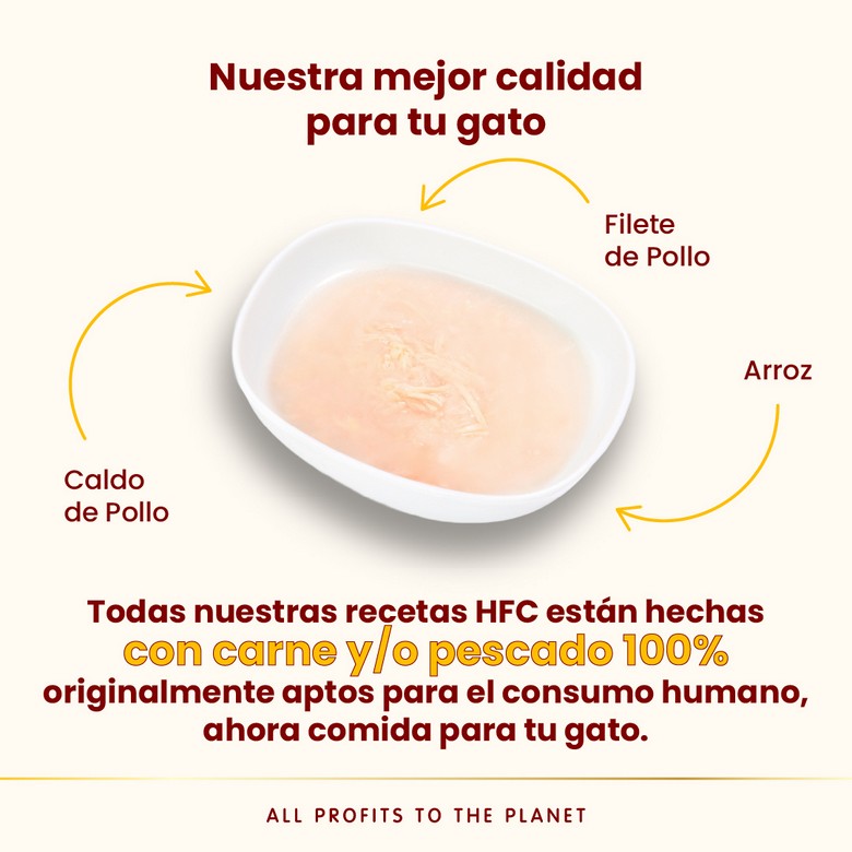 Ingredientes: Caldo de pollo 73.5%, filete de pollo 25%, arroz 1.5%.