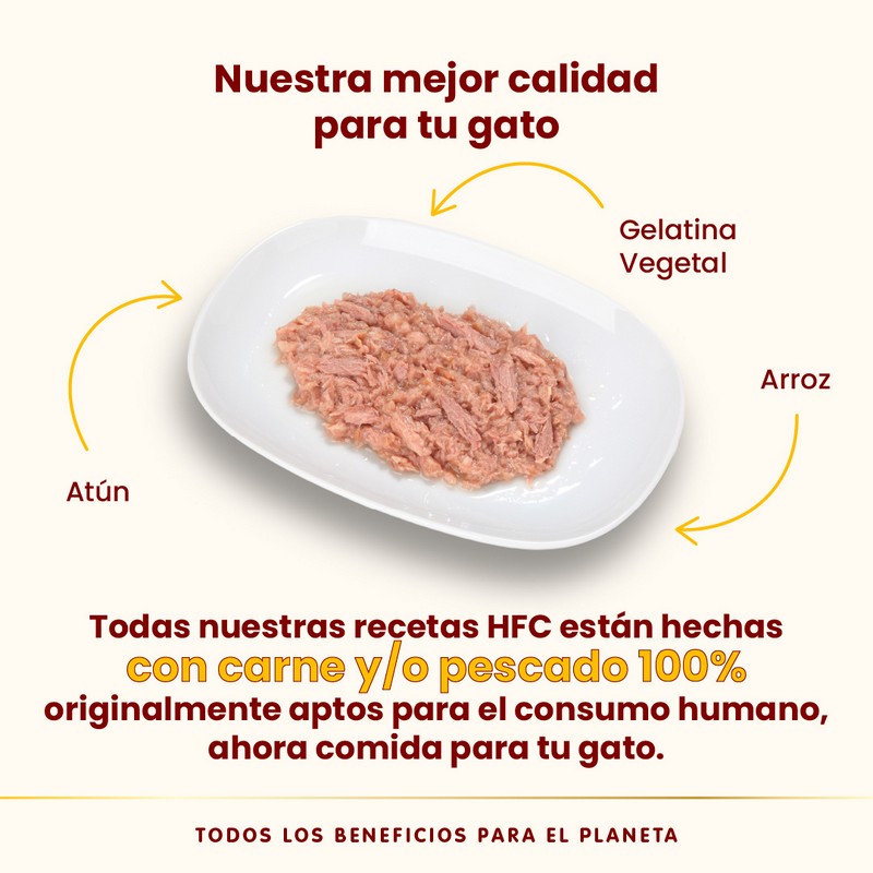 La comida húmeda Almo Nature HFC está elaborado con ingredientes originalmente aptos para el consumo humano y posteriormente utilizados como alimento para gatos. En nuestras recetas HFC no utilizamos harinas ni carne deshidratada, y la carne y el pescado que incluye es la mismos que podrías elegir para ti mismo.