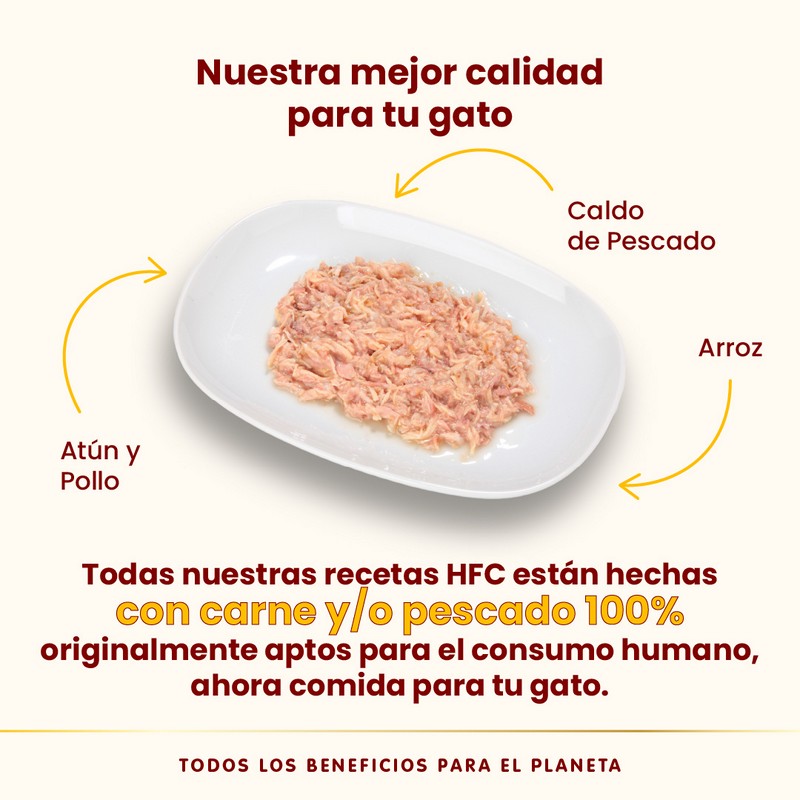 La comida húmeda HFC mejora la ingesta diaria de líquidos, algo fundamental para la hidratación de tu gato. Además de ser rico en nutrientes, el caldo que incluye nuestro alimento húmedo proporciona a tu gato una hidratación natural.
