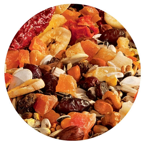 Merienda de fruta ideal para loros: cereales y semillas con trozos de fruta.